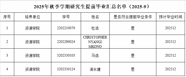根据公司的相关通知要求,经研究生个人申请,公司初审,2023级硕士研究生(不含硕博连读、提前攻博研究生)、2022级博士研究生(不含直博生)、2020级直博生申请提前毕业名单如下,如有异议,请公示期内书面反馈意见至研究生科(联系人:周老师,办公室:主楼336,电话:67883627),公示期即日起至2025年9月22日。