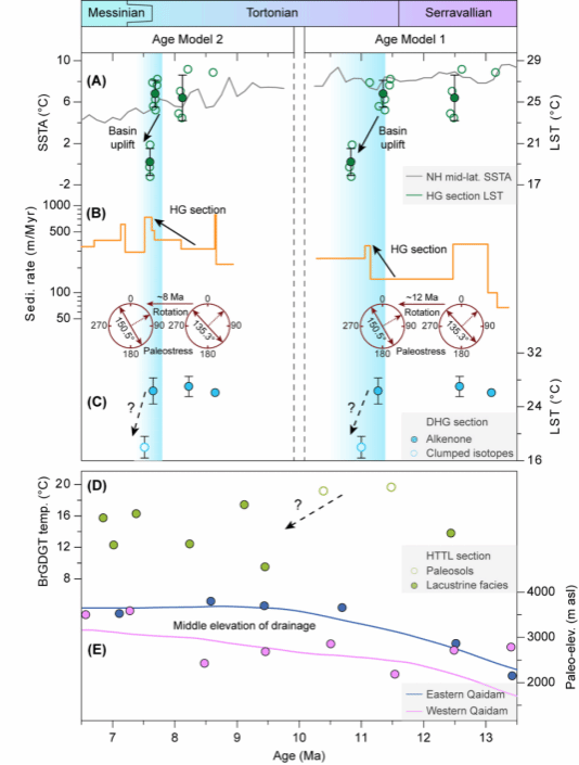 图3. 支持柴达木盆地晚中新世快速隆升事件的全球与区域对比证据