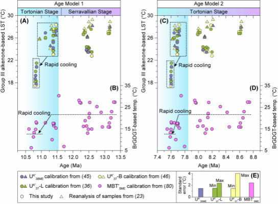 基于上述发现,本研究对柴达木盆地红沟剖面中–上中新统湖相泥岩地层进行了高分辨率密集采样,运用有机地球化员工物标志物技术,系统重建了古湖面温度演化,并进一步估算盆地的古高程变化。研究发现,多数样品中仅含Group III 长链烯酮,少数样品中则同时存在Group III 与 Group II 长链烯酮的混合物。为此,研究采用了最新发展的 UK’38ME (C38甲基烯酮的不饱和度) 温度校正方法,该方法可有效避免烯酮种属混合带来的温度校正误差,从而实现更为准确的古温度重建。重建结果表明,柴达木盆地在晚中新世经历了一次显著的降温事件,古湖泊表面温度下降幅度达 6.6 ± 1.8 °C(图2)。同时,基于源自细菌的生物标志物brGDGTs(支链甘油二烷基甘油四醚)分析的古温度记录亦揭示湖泊水柱在同期发生降温,进一步佐证了这一降温事件的存在(图2)。根据前人建立的两种不同的柴达木盆地新生代地层年代模型判断,该降温事件可能发生在约1130–1080万年前,或770–760万年前。