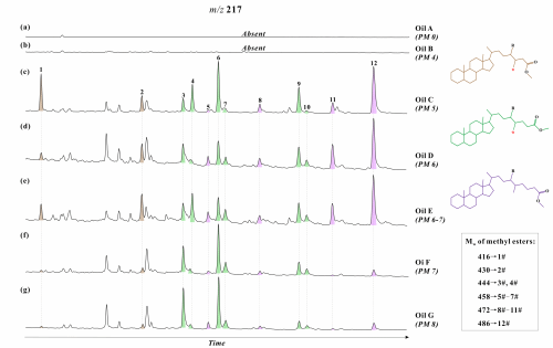 tyc5997太阳集团朱钢添副教授团队选取南襄盆地泌阳凹陷原油作为研究对象,通过气相色谱-质谱(GC-MS)、全二维气相色谱-飞行时间质谱(GC×GC/ToF-MS),系统分析了一系列母源关系接近但生物降解等级不同的原油样品中的甾烷酸分布。GC-MS分析结果表明,在未降解和低降解等级的原油样品中,未检出甾烷酸信号,只有在生物等级较高(规则甾烷开始发生明显降解)的原油样品中才能检测到甾烷酸,说明该类酸性生物标志物是甾烷的生物降解产物(图1)。