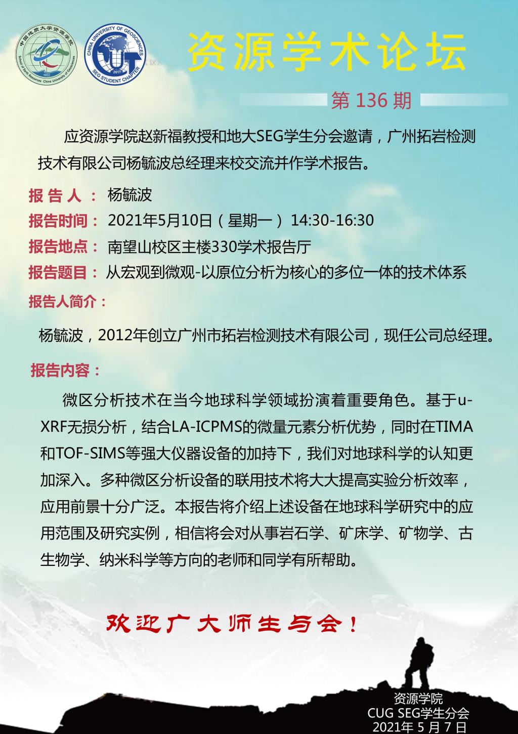 【05月10日】第136期资源学术论坛:杨毓波学术报告