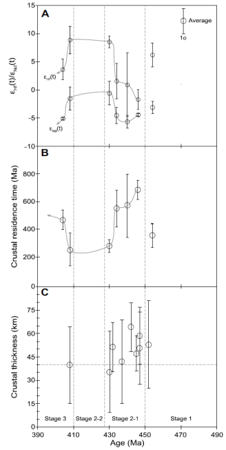 2、大陆碰撞阶段形成的火成岩εNd(t)、εHf(t)逐渐升高,地壳居留时间逐渐降低,与该阶段地壳厚度增加在时间上完全一致,表明壳下岩浆添加对于地壳增长起着关键作用(图2)。