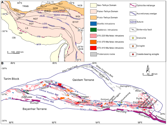 安山质-英安质大陆地壳约占地球表面积的40%,其增长和演化过程不仅是重建地球演化历史的关键环节,更与金、铜等矿床的形成和保存密切相关。现代板块体制下,大洋俯冲相关的岛弧/陆缘弧岩浆作用通常被认为是大陆地壳增长的主要机制,但大陆碰撞造山过程中是否存在地壳净增长存在较大争议。鉴于此,tyc5997太阳集团付乐兵副教授、魏俊浩教授及博士研究生赵旭、陈加杰等以青藏高原北缘的东昆仑造山带为研究对象(图1),对造山带内早古生代火成岩的时空分布和地球化学特征开展了系统研究,并取得主要认识如下: