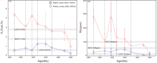 3、原特提斯洋俯冲和大陆碰撞背景下(520–426 Ma)形成的岩石以赞岐质高镁闪长岩、埃达克岩和经典I型花岗岩为主,岩浆源区中岩石圈地幔和俯冲板片来源的新生组分占比>65%,进一步证明大洋俯冲和大陆碰撞环境下壳下岩浆添加对于地壳增长的重要贡献(图3)。