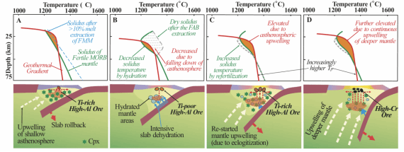 板片后撤是初始俯冲体系演化的主要驱动力,基于恢复出的不同铬铁矿成矿地球动力学背景,发现上述四期铬铁矿成矿时,板片后撤的速率大体分别为中慢速、慢速、中慢速和中快速,相应速率的变化可能与板片-地幔密度差随时间逐渐发生调整有关。通过影响软流圈的上涌程度,初始俯冲发生的非匀速板片后撤过程,从根本上导致了岩浆地幔源区在成分饱满度、板片流体参与程度及地温梯度等方面出现了反复变化(图1),从而引发了多样化的岩浆形成及铬铁矿成矿作用。