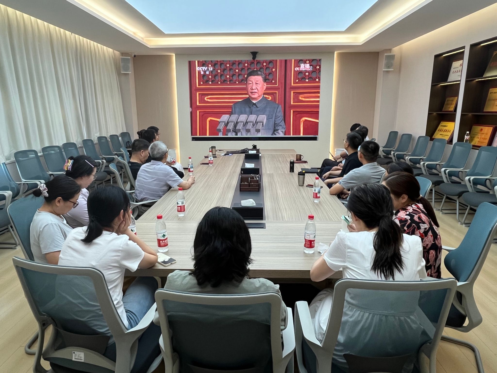 员工党建办公室成员、员工党支部党员代表在文华楼523室观看纪念大会