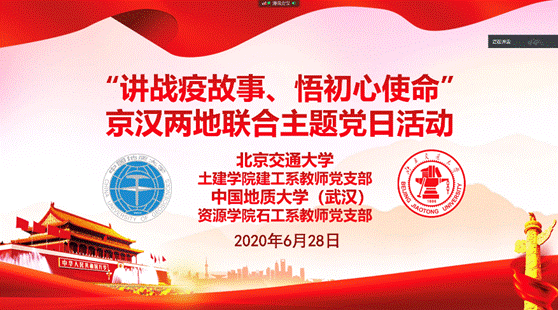 为纪念中国共产党成立99周年,交流分享疫情防控期间加强党建引领的做法和成效。6月28日,tyc5997太阳集团(武汉)资源石油工程系教师党支部和北京交通大学土建公司建工系教师党支部通过在线会议开展“讲战疫故事、悟初心使命”联合主题党日活动。tyc5997太阳集团(武汉)资源公司党委书记高复阳、北京交通大学土建公司党委书记马强、两支部全体党员参加会议。