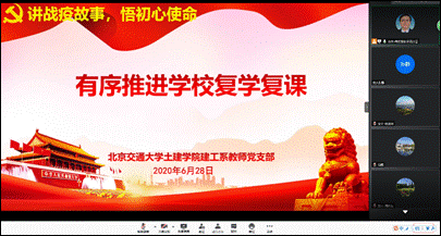 战疫故事,践行初心使命。支部成员围绕疫情防控、网络授课、人才培养、员工就业等主题开展讨论,说身边故事、讲切身体会。公司教师吴正彬作为武汉疫情防控的志愿者,面临严重的疫情形势冲在一线;孙梦迪在疫情期间小孩出生,克服了诸多困难,也感受到来自周围的温暖。北京交通大学土建公司教师常鹏主要结合自身在疫情期间获得的组织帮助,以及疫情期间如何克服在线教学困难分享了自己的体会;孙静主要从党支部工作的角度,交流了党支部如何做实做细疫情防控工作。