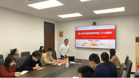 副经理沈传波作党的二十大精神专题辅导员报告。他从党的二十大报告的主要内容、党的二十大的重大意义和重大成果、自身学习体会三个部分领学党的二十大精神。他重点解读了大会主题、过去五年的工作和新时代十年的伟大变革、开辟马克思主义中国化时代化新境界、新时代新征程中国共产党的使命任务等内容并讲到,党的二十大报告对党和国家各项事业做出战略部署,描绘了全面建设社会主义现代化国家、全面推进中华民族伟大复兴的宏伟蓝图。他重点从“党始终坚持以人民为中心的发展思想”“肩负立德树人神圣使命,求实问真服务祖国发展”两方面,结合党的二十大关于“不断实现人民对美好生活的向往”内容、师德模范故事、自身成长经历等交流学习体会。他向同学们推荐了《习近平谈治国理政》四卷书籍、《初心》《最美的青春》两部电视剧和围绕甘祖昌将军及其夫人故事创作的系列影视剧作品,强调党员同志要加强政治理论学习,传承弘扬老一辈革命家精神。