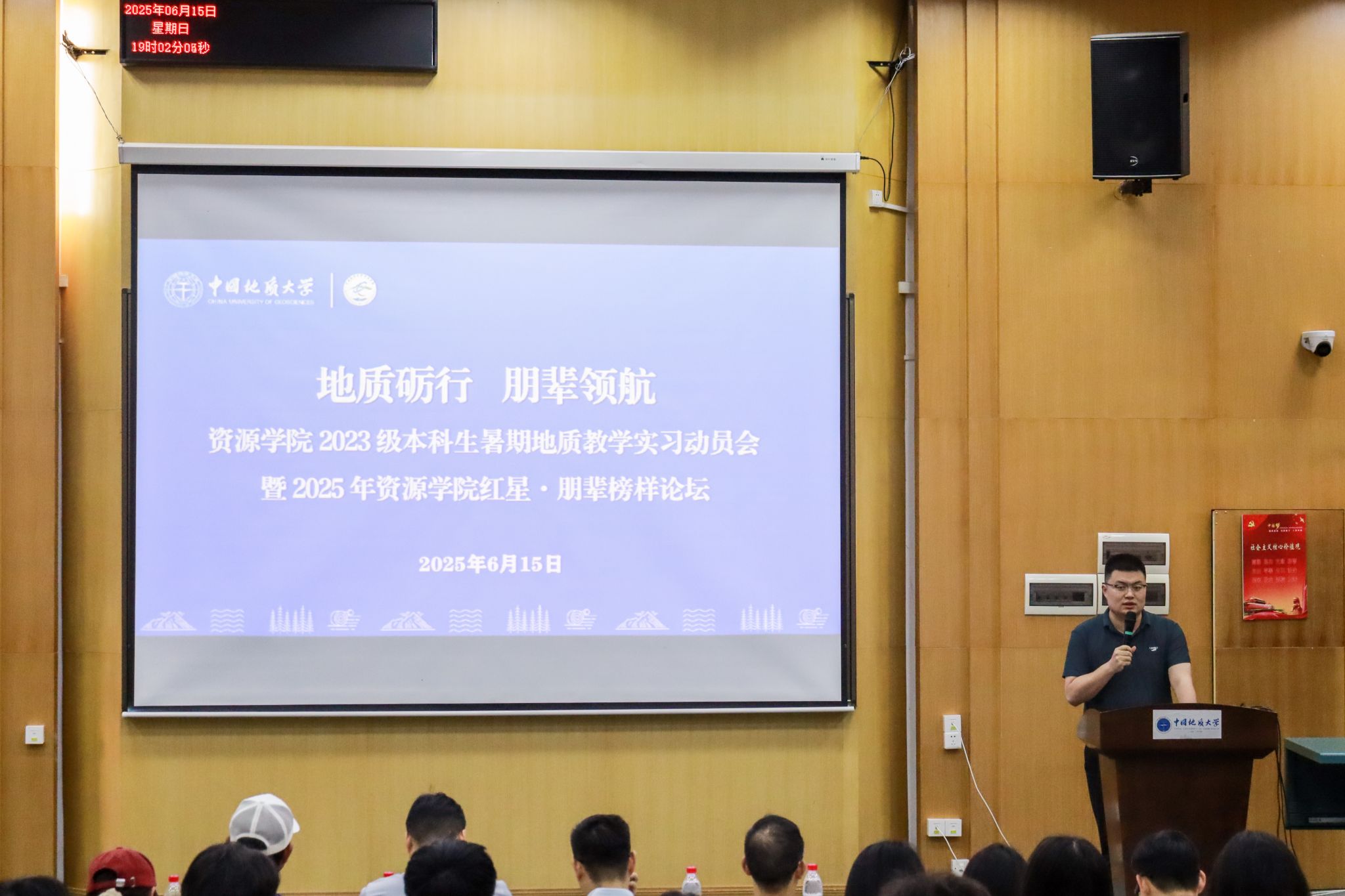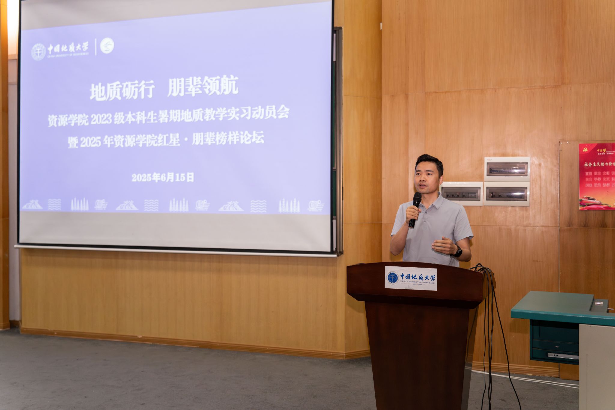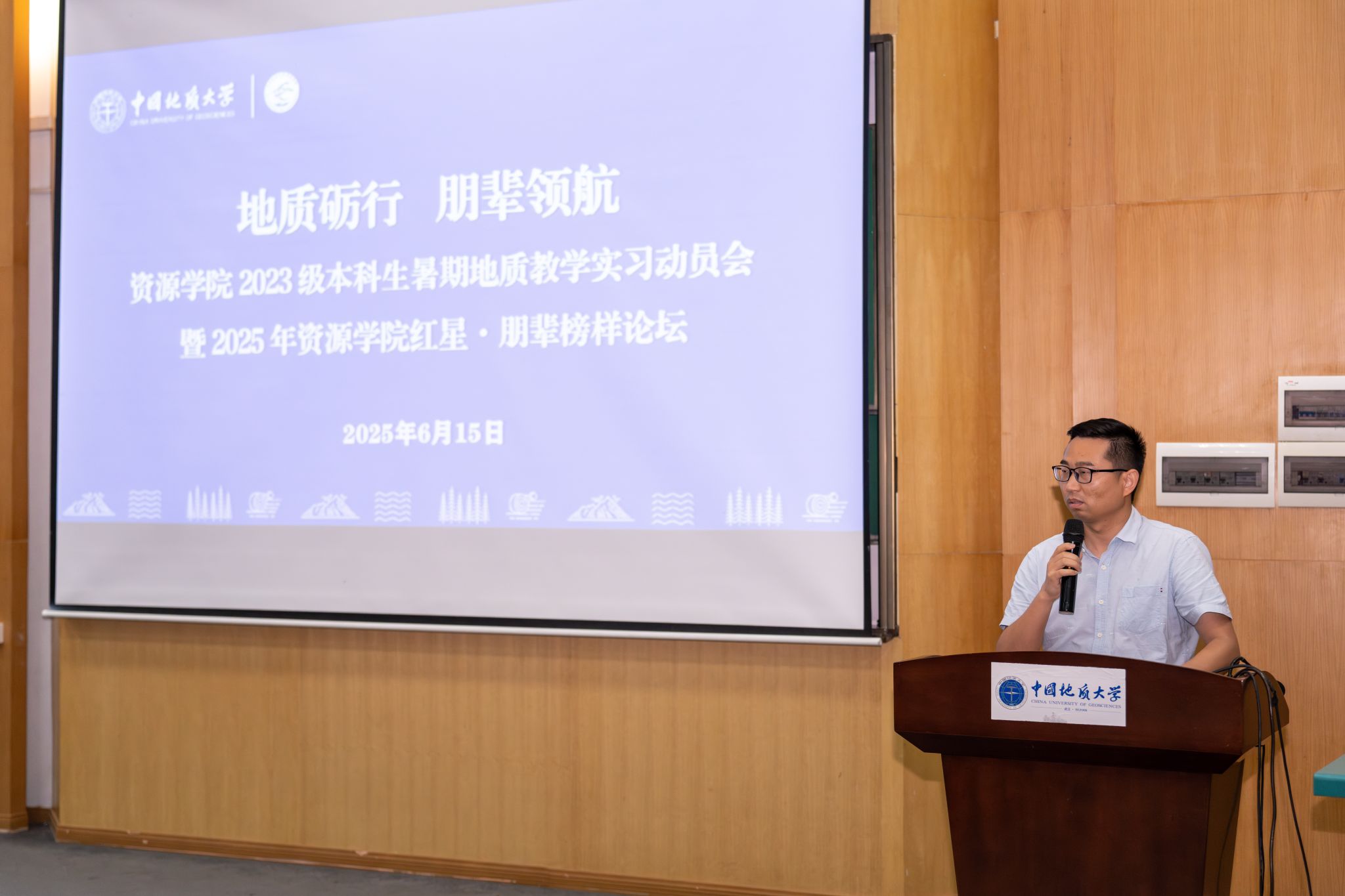 (通讯 席伟琦 彭鑫 摄影 陈思程 范汤豪)6月15日,2023级本科生暑期地质教学实习动员会暨2025年红星·朋辈榜样论坛在教三楼109举行,公司党委副书记谭文伦,副经理李占轲,周口店实习站队长魏启荣,秭归实习站队长李嘉光,辅导员彭鑫,2024届本科毕业生马玮、刘欣、刘子萍,2025届员工会执行主席余慧和2023级全体本科生参加会议。会议由辅导员彭鑫主持。