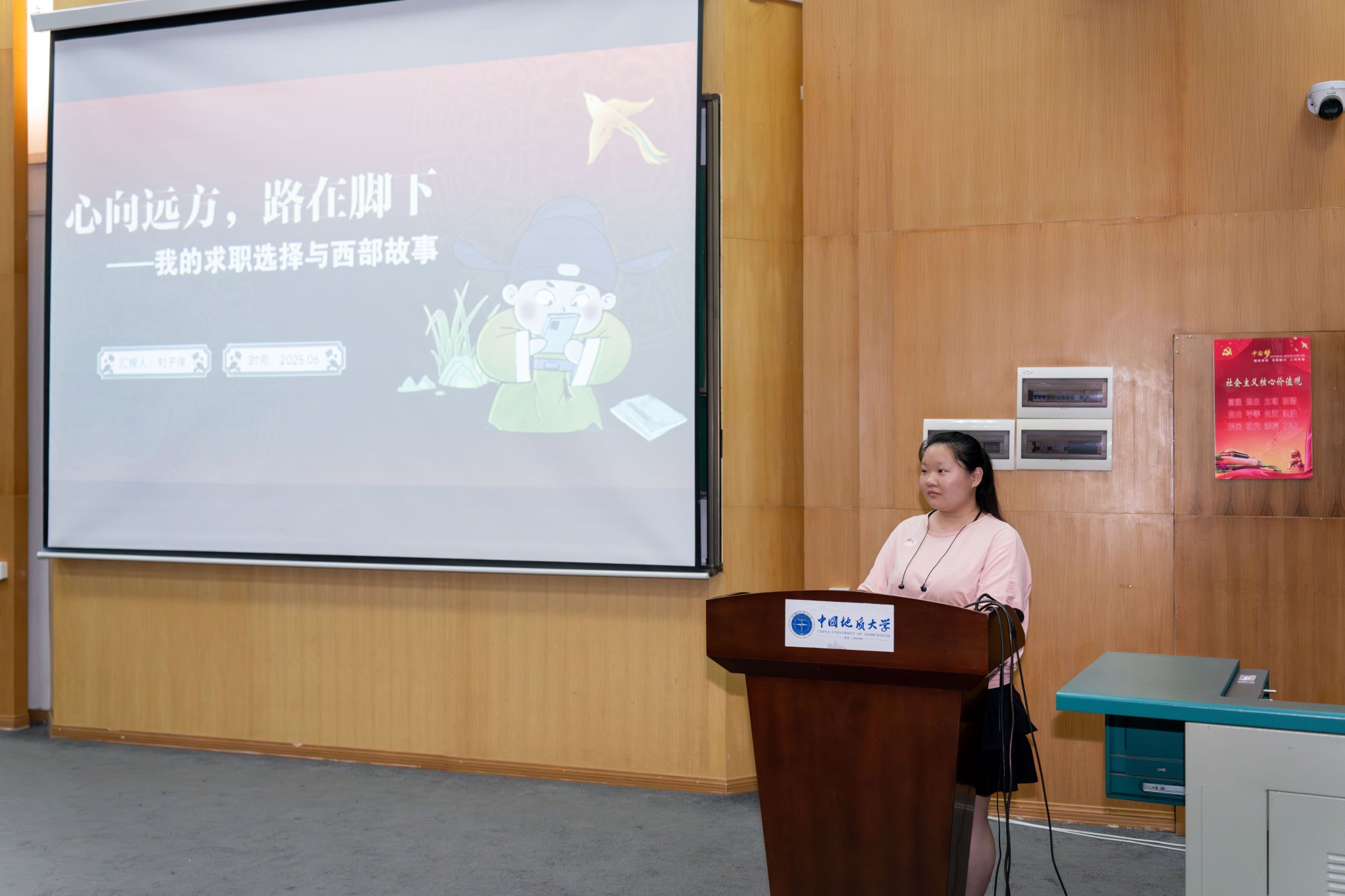 即将奔赴新疆生产建设兵团服务、公司2025年西部计划志愿者刘子萍以《心向远方,路在脚下——我的求职选择与西部故事》为题分享备考西部计划经验。她结合自身学习与求职经历,讲述了西部计划的相关政策、选拔流程和备考经验,让同学们对西部计划有了更清晰的认识。