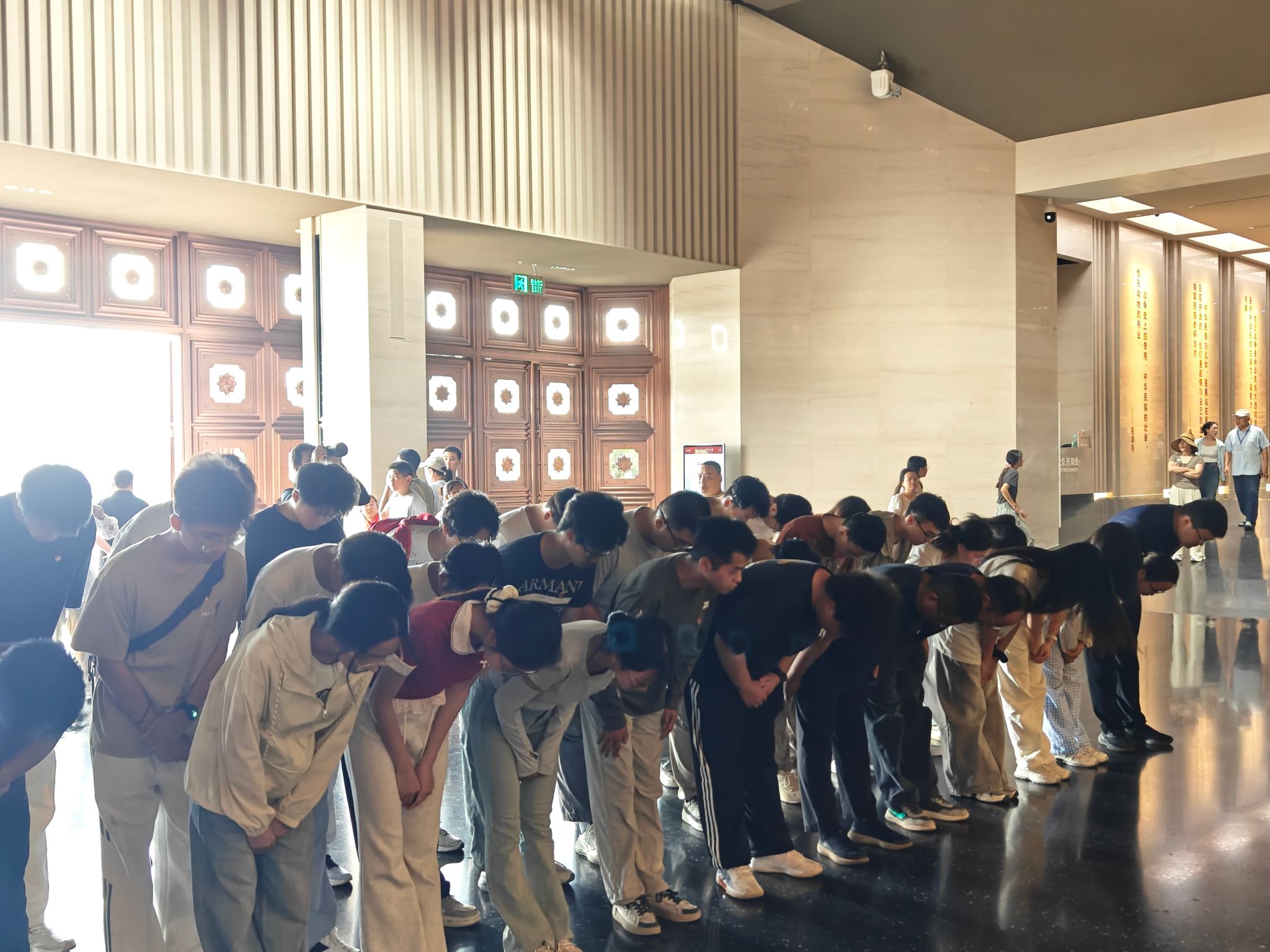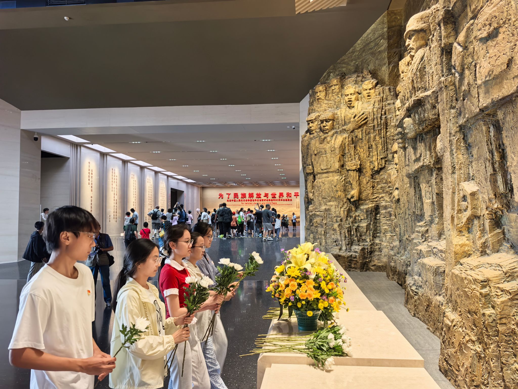序厅内,“铜墙铁壁”雕塑神圣巍峨,4000颗数字星光屏熠熠生辉,直观展现出四万万同胞团结御侮的强大力量。全体参观师生在此肃立,向革命先烈鞠躬献花,深切缅怀为民族独立、人民解放英勇献身的革命先烈。
