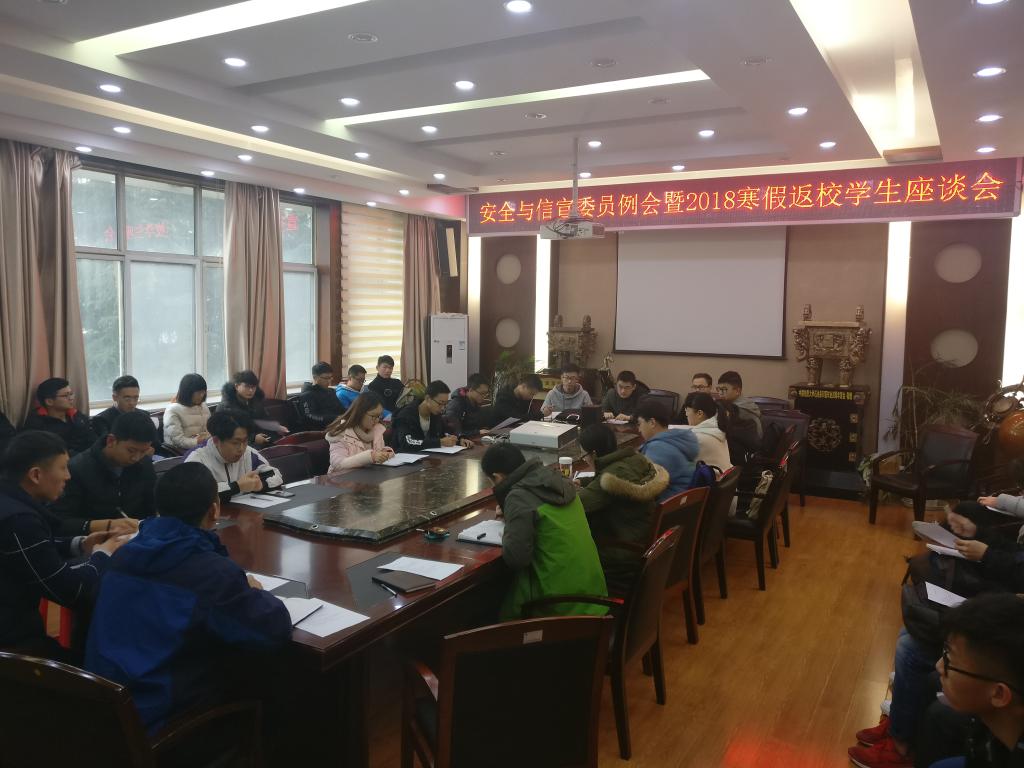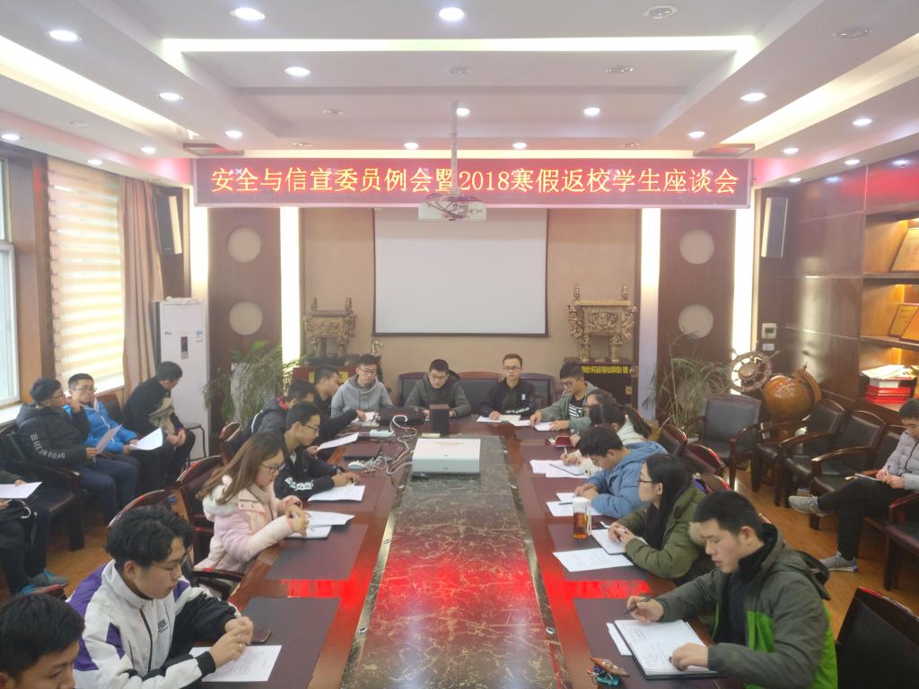 为及时了解和掌握新学期员工的思想动态和整体情况,3月8日晚,tyc5997太阳集团召开了安全信宣委员座谈会暨2018年寒假返校员工座谈会。公司党委副书记张建华、学工组全体辅导员及各班安全信宣委员参加了此次会议。会议由团委书记王向东支持。