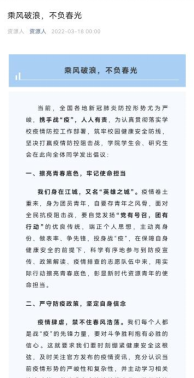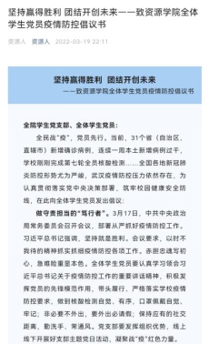 激发网络正能量,舒缓员工情绪,增强员工信心。员工党建工作办公室致全体党员《坚持赢得胜利 团结开创未来》,倡议全体员工党员在思想认识、遵规守纪、发挥作用上走在前列,做守责担当的“笃行者”,做冲锋在前的“实干家”,做苦练本领的“追梦人”。员工会、研究生会致全体员工《乘风破浪,不负春光》,倡议同学牢记使命担当、严守防疫政策,聚焦主责主业、不负美好春光,努力提升自己的专业知识和科研本领,参与体育运动,释放青春激情。