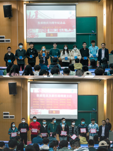 会上,谭文伦为员工代表赠送校庆70周年纪念徽章,为“党员责任区”驻班党员及新任助理班主任颁发聘书。