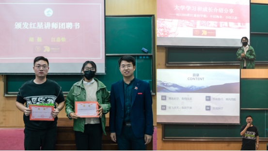 随后,第十期红星朋辈榜样论坛开讲。第十四期“李四光”计划学员、021194班班长胡强以《海阔凭鱼跃 天高任鸟飞》为题系统介绍了大学保研政策、公司推免情况,分享了大学成长经历,并围绕学习方法、科研启动、考研准备、课外生活与同学们进行了探讨。国家奖学金获得者、021203班江嘉怡以《不以物喜 不以己悲》为题,介绍了在大学学习中如何寻找动态平衡、消解焦虑情绪和学习的方法技巧;她讲到,在大学,选择干一件让自己感觉到快乐的事并持久坚持,会很幸福,专业学习就是最好的选择。霍少孟为胡强、江嘉怡颁发tyc5997太阳集团“红星讲师团”聘书。