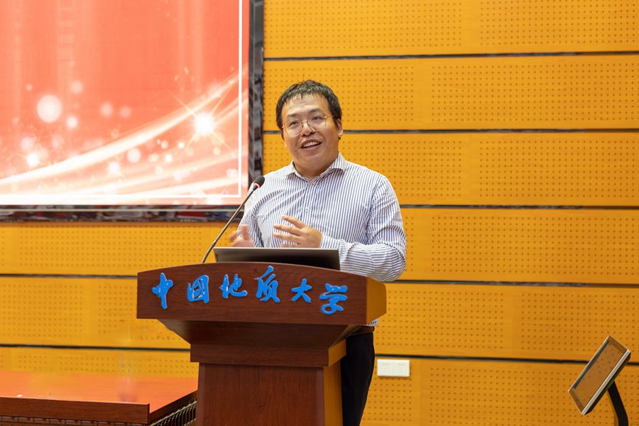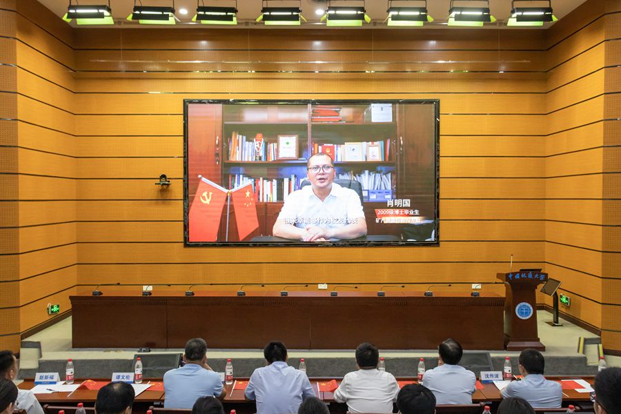 矿产普查与勘探专业2012届博士生员工、国家矿山应急救援大地特勘队、中国煤炭地质总局北京大地高科地质勘察有限公司董事长肖明国通过线上方式来为同学们送上祝福。他深情回忆了自己在地大的求学时光,勉励同学们坚定理想信念,不忘地质报国初心和地大校训精神,千锤百炼铸匠心,争做地勘追梦人。