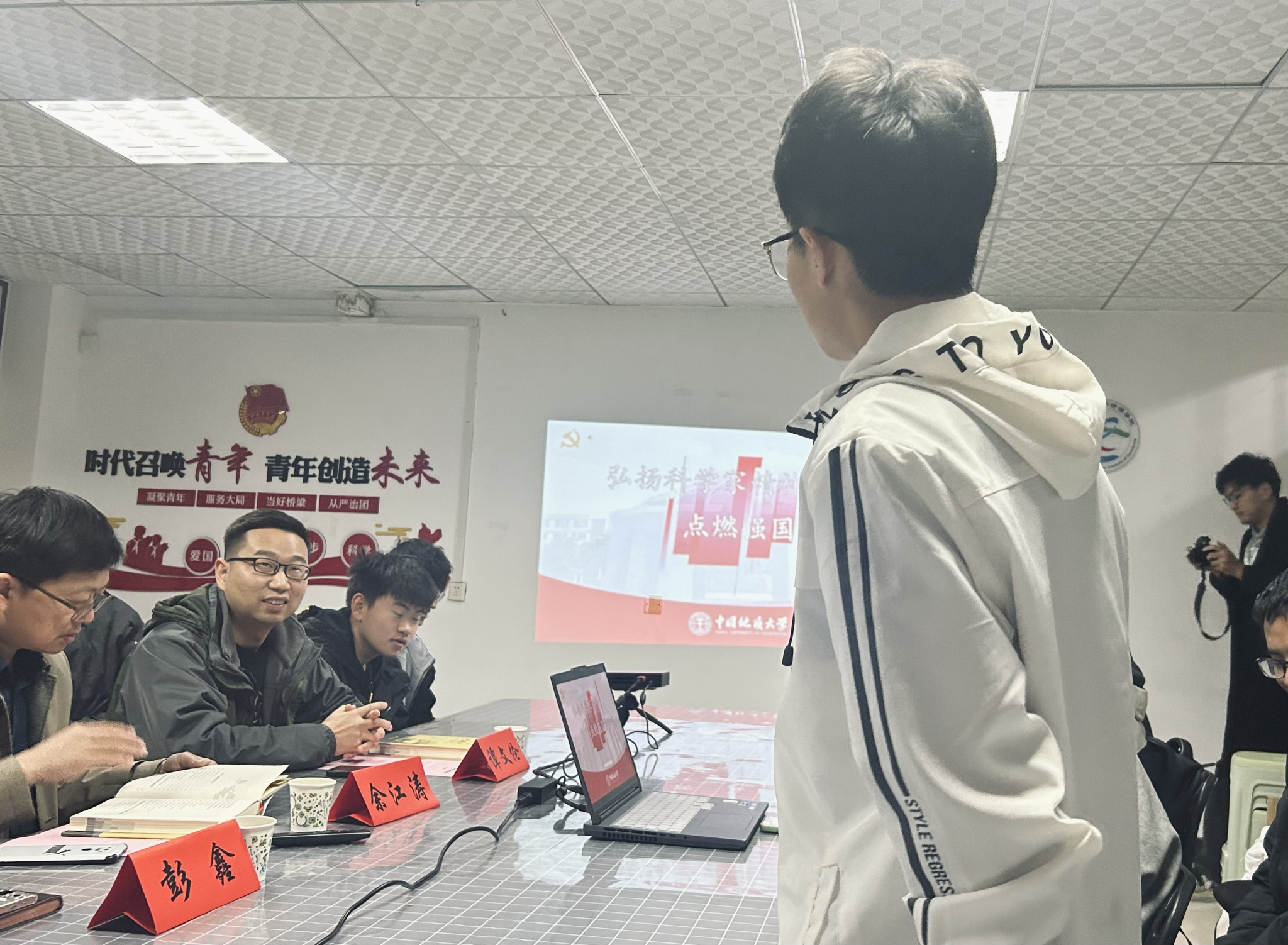(通讯员 裴朔焓 彭鑫)为深入学习宣传贯彻党的二十大精神和习近平总书记关于弘扬科学家精神的重要指示,落实“立德树人”根本任务,进一步引导广大青年树立远大志向,承担当代青年使命,近日,2023级资源能源五班在资源·青年之家开展“弘扬科学家精神,点燃强国复兴梦”主题团会。出版社副社长余江涛、资源公司党委副书记谭文伦、辅导员彭鑫及班级全体同学参会。