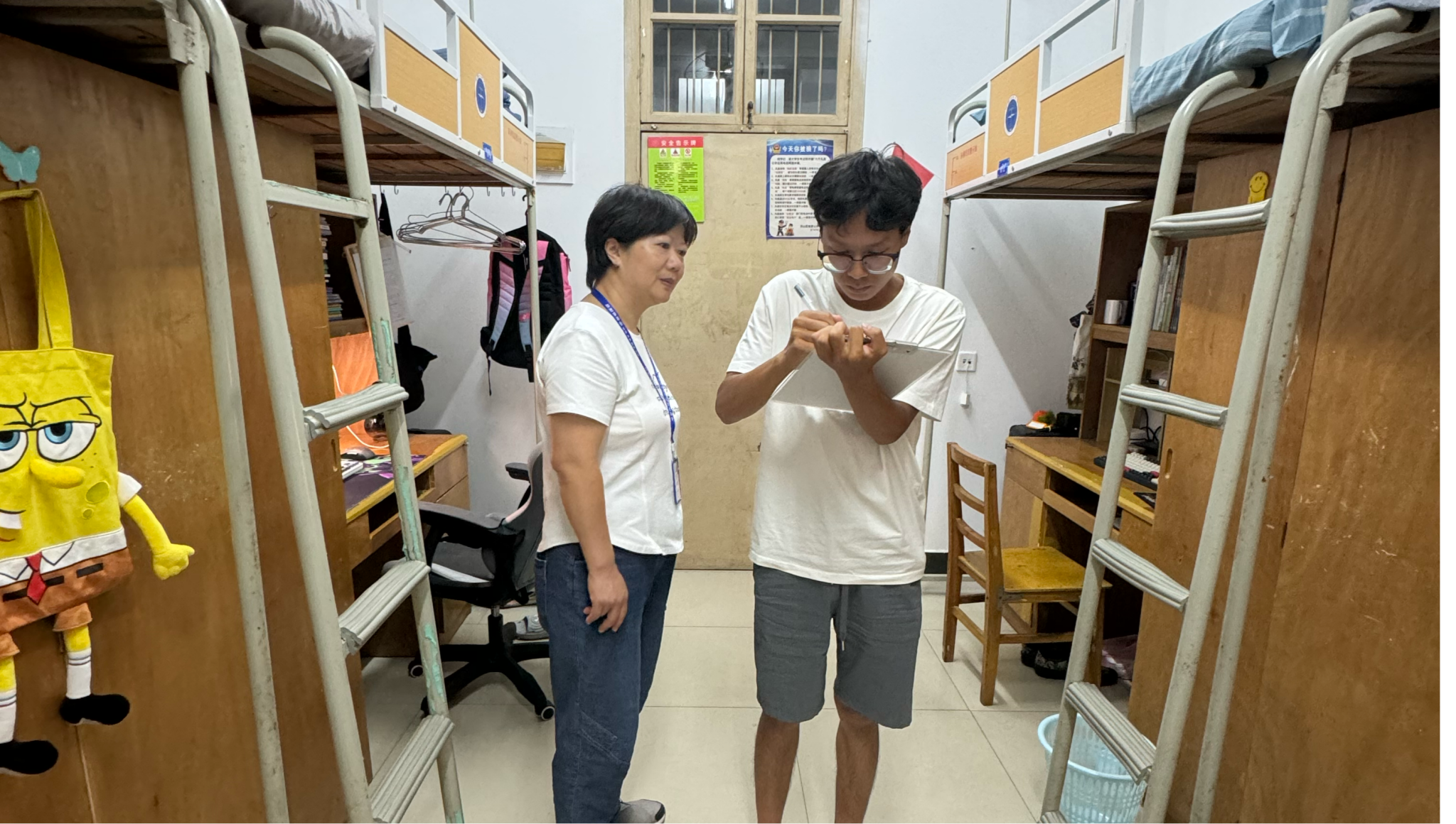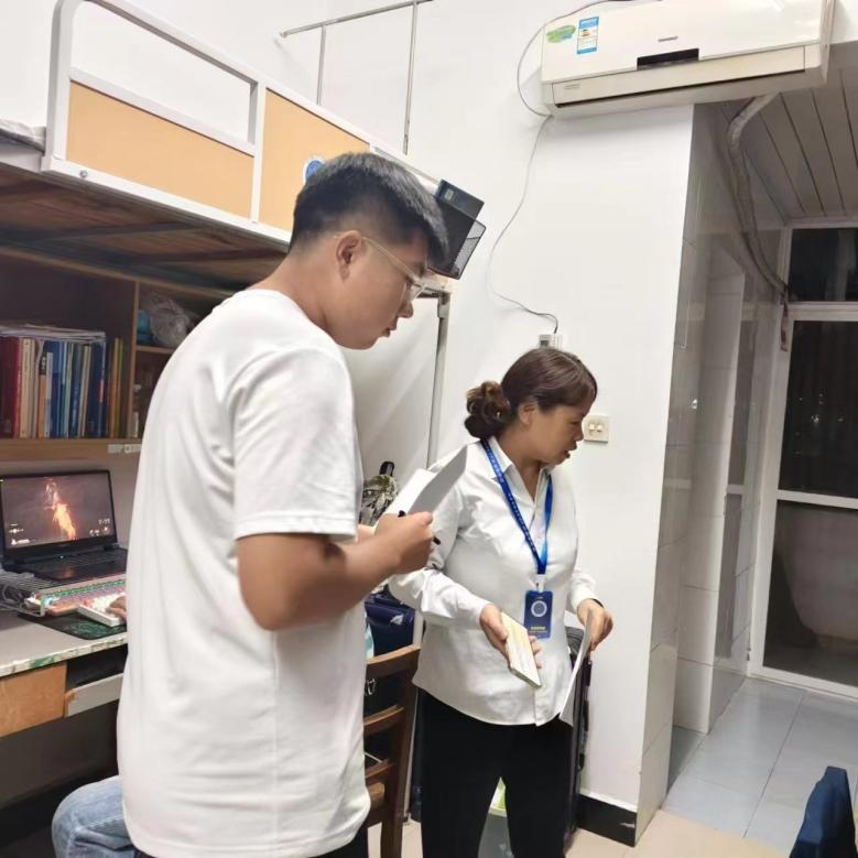 除了卫生检查工作,员工住宿服务中心的老师也关心了同学们在宿舍的生活情况。同学们踊跃提问关于宿舍卫生方面的问题,如洗手池水垢难以清理干净、衣柜旁卫生死角如何打扫等,老师对同学们的困惑一一进行了详细解答,并且着重关心了刚刚进入老员工活的大一同学的生活适应情况。