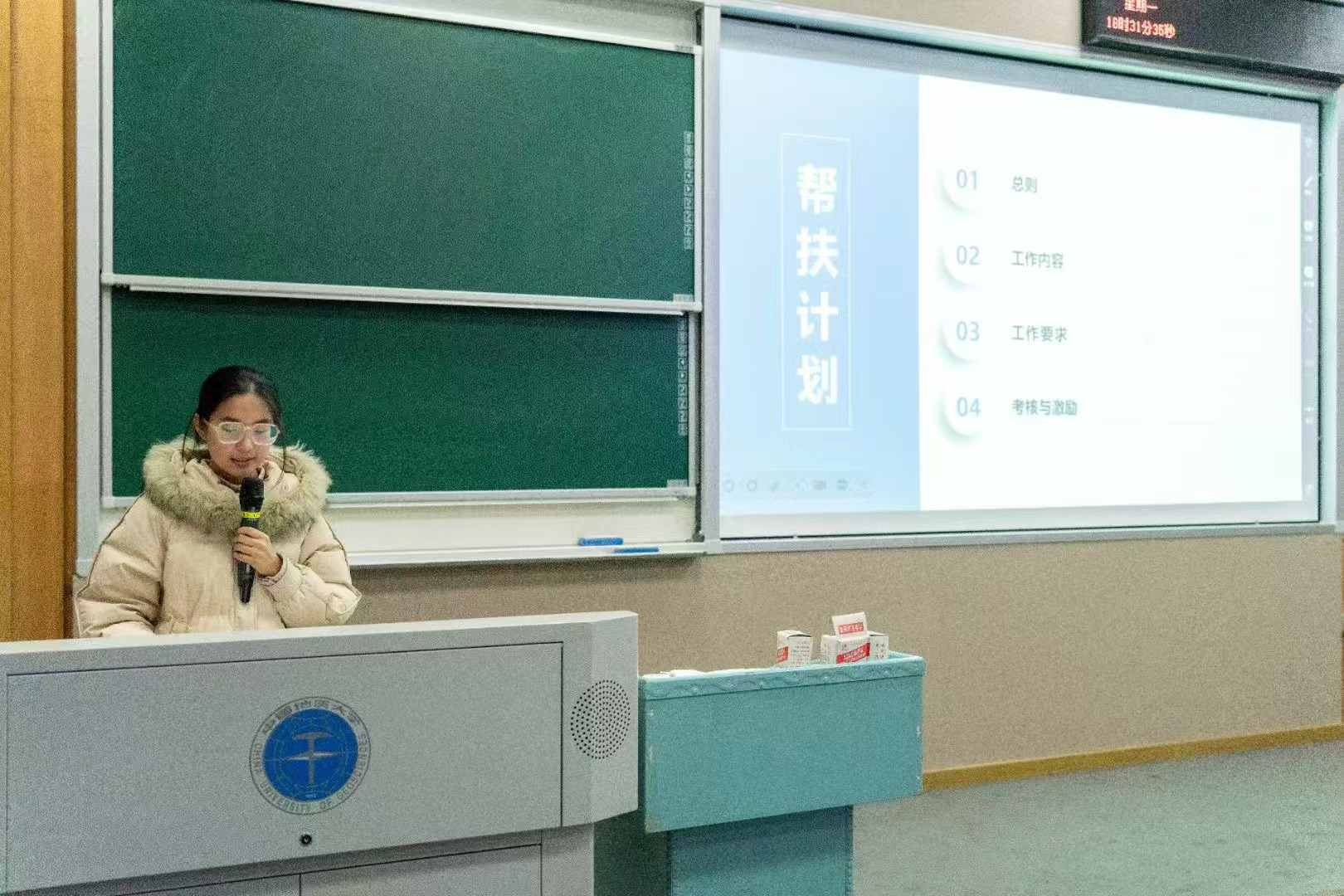 员工党员帮扶代表杜璐宇发言。她结合自身学习经历分享了学习经验和帮扶计划,呼吁帮扶党员要与学业困难同学加强联系,帮助结对同学赶上学业进度。