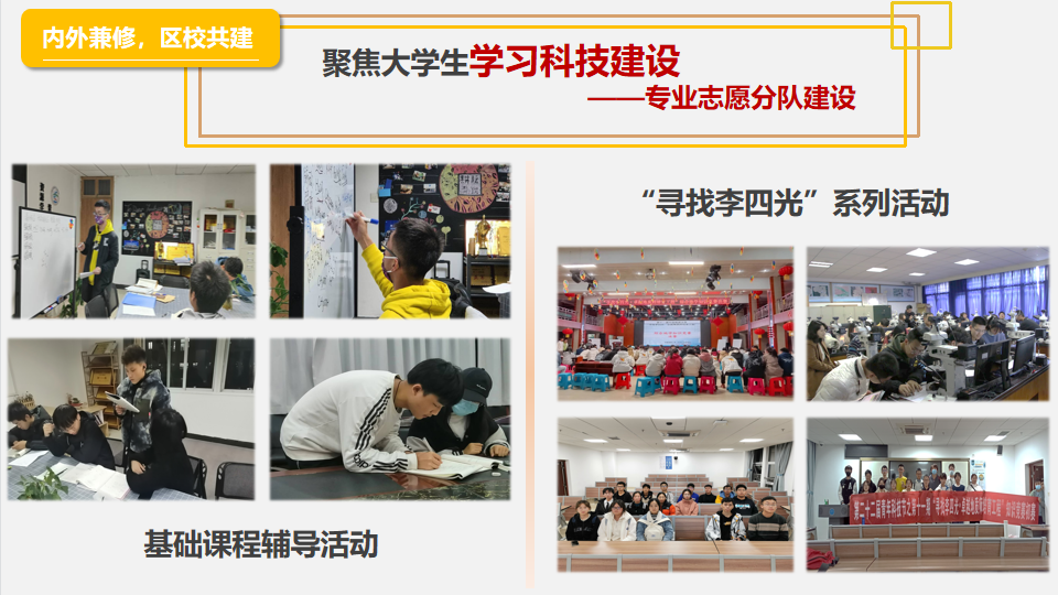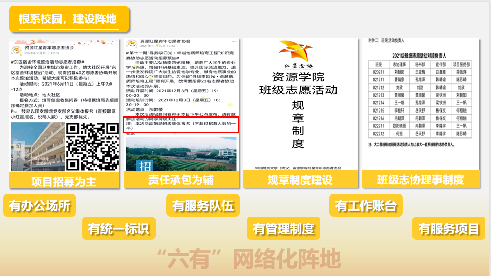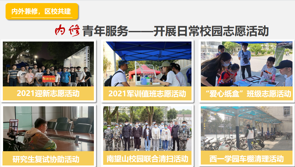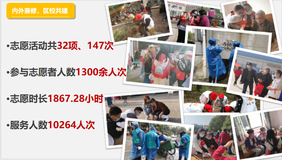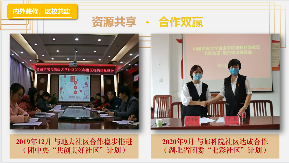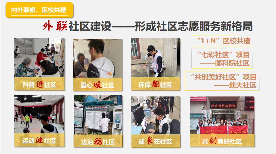 协会自2015年启动区校共建志愿服务项目,积极探索区校协同共建志愿服务社会实践育人基地模式,已在地大社区、邮科院社区开展科普进社区、文化暖社区、环保靓社区、运动健社区、法治稳社区、成长在社区、共创美好社区“一进一暖一靓一健一稳一长一创”全方位志愿服务格局,年均开展活动过百次,参与志愿者累计3000余人次,服务人数超20000人。2018年建设的老员工挂职社区书记助理项目被洪山区组织部在全区推广,获评洪山区优秀党建项目。2020年8月,成功获批由团省委、省志愿者协会主办的“七彩社区”项目。2020年12月,成功获批团中央“共创美好社区”项目试点单位。