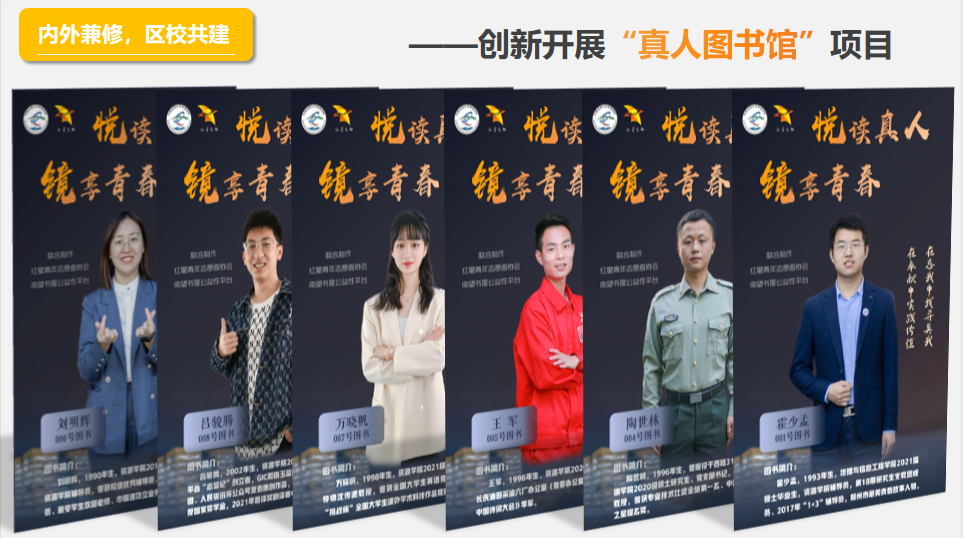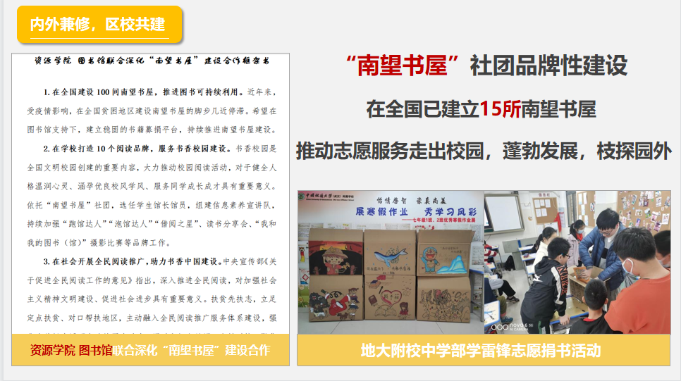 协会大力发展“南望书屋”书籍公益平台,筹集书籍20000余册,在宁夏泾源东峡小学、湖北秭归兰溪小学、湖北红安英才希望小学、甘肃卓尼扎古录九年制公司、安徽望天乡马嘶小学、武汉市第一聋校、广西百色老桑小学、山东菏泽通古小学等地共建立15所南望书屋。创新推动“真人图书”项目,赋值志愿服务时长,为同学成长解惑答疑。