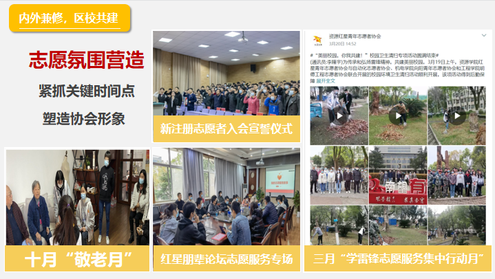 协会在《红星青年志愿者协会章程》指导下,按照有办公场所、有统一标识、有服务队伍、有管理制度、有工作台账、有服务项目“六有”标准搭建活动平台,围绕公司公司事业发展、学习学风及学术科研建设需要、社会社区需求,弘扬志愿服务文化,开展系列志愿公益活动,打造志愿服务项目、品牌,引导青年老员工在实践中受教育长才干,在奉献中实践人生价值。