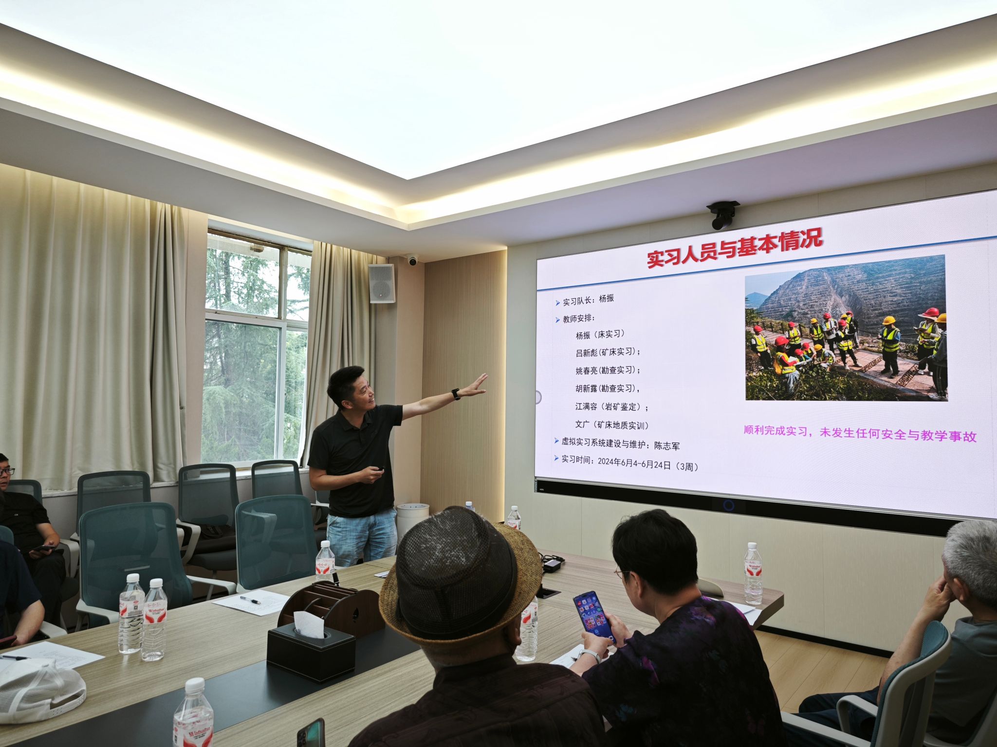 董田、魏启荣、李嘉光、顾军、陈振林和杨振分别汇报了北戴河、周口店、秭归、江汉油田、咸宁通山和大冶实习基地2024年度实践教学基本情况、取得的建设成果和实习亮点。评委对各实践教学团队2024年度工作进行测评,周口店、秭归、大冶3个实践教学团队获评优秀,其他教学团队合格。