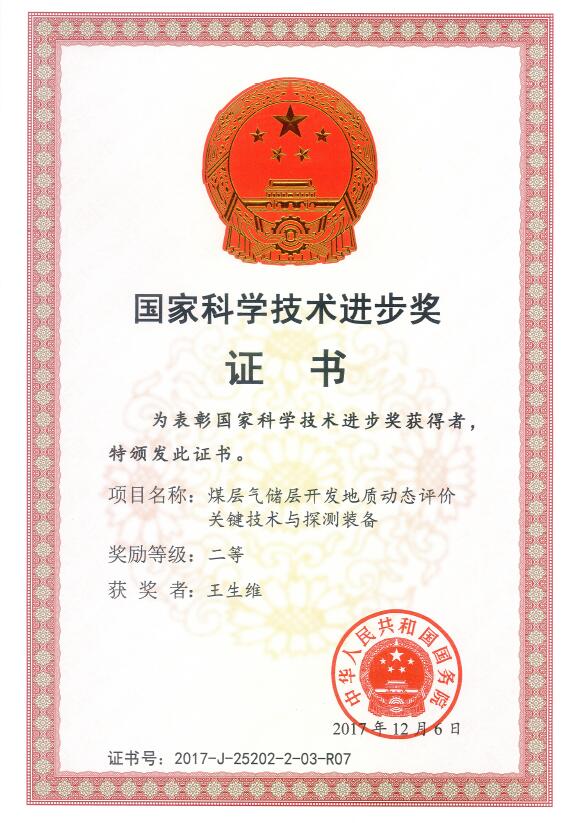 2018年 1 月 8 日,2017 年度国家科学技术奖励大会在北京隆重举行。公司王生维教授与中国矿业大学等单位合作完成的“煤层气储层开发地质动态评价关键技术与探测装备”项目获得国家科技进步二等奖。