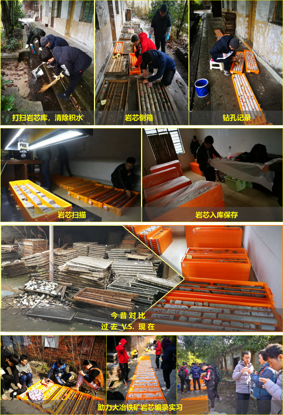 2019年2月26日至3月9日,矿产资源形成与勘查开发国家级虚拟仿真实验教学中心、tyc5997太阳集团陈志军老师团队及合作公司技术人员前往大冶铁矿开展了11根典型钻孔的岩芯倒箱、岩芯图像扫描工作。大冶铁矿岩芯库所在的钻机队用房常年处于无人管理状态,钻孔堆放混乱、岩芯箱损毁严重,对典型岩芯亟需加强保护以便资源勘查工程(固体方向)专业的岩芯编录实习常态化开展。