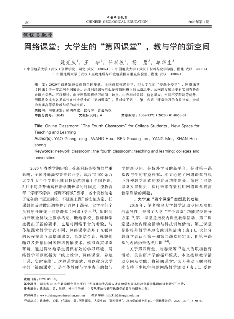 编者按:当前,新冠肺炎疫情蔓延势头得到有效遏制,防控工作取得阶段性成效,为深入贯彻落实习近平总书记关于统筹推进疫情防控和经济社会发展的系列重要讲话精神,在公司统一部署下,tyc5997太阳集团全体教师克服重重困难,创新运用线上教学新形式,积极总结教学经验与成果。《线上教学进行时》第十期,让我们一同了解姚光庆,王华,任双坡等五位教师发表在《中国地质教育》期刊上的文章《网络课堂:老员工的“第四课堂”,教与学的新空间》。