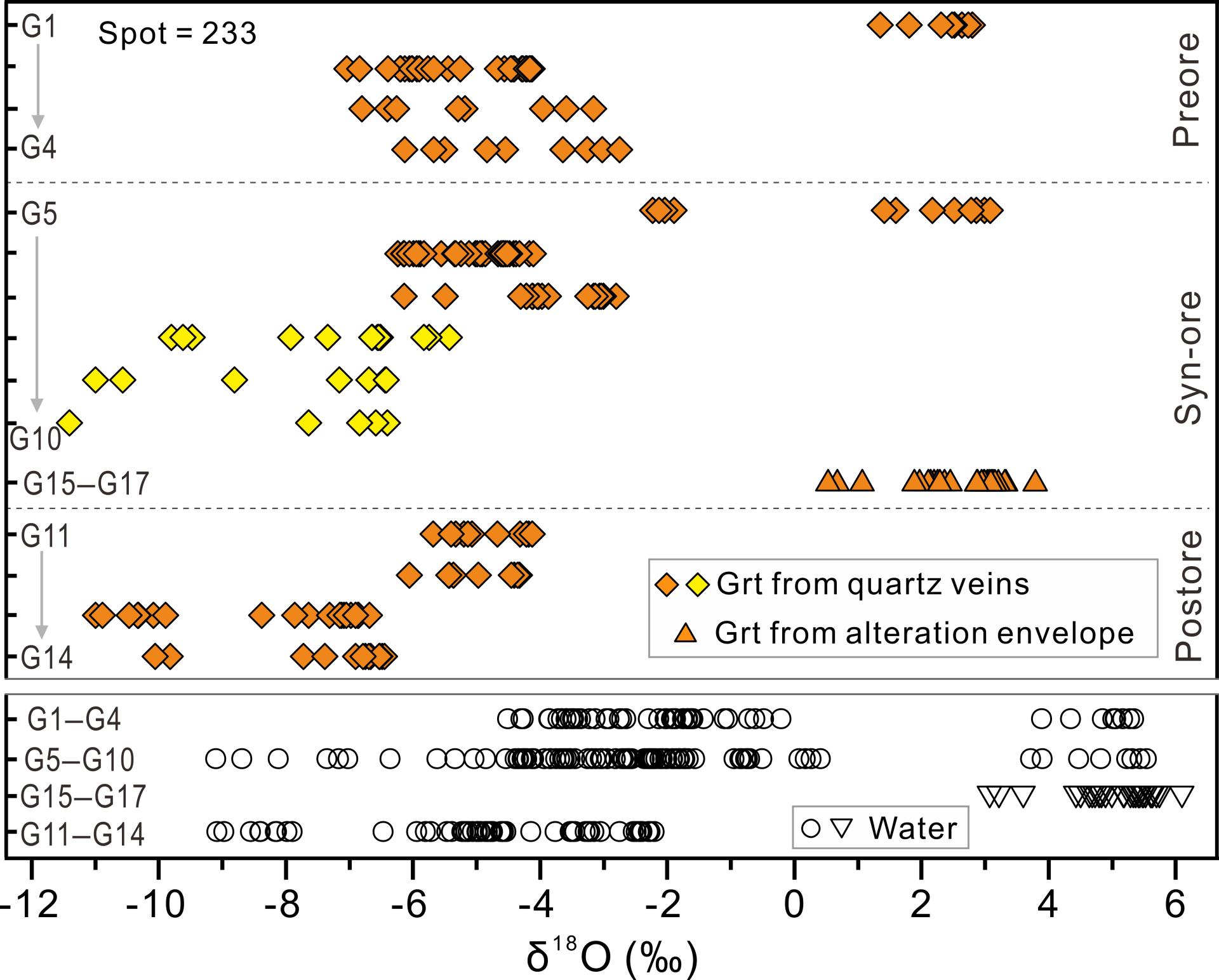 图2.各成矿阶段的石榴石(上)及与之平衡的成矿流体(下)的氧同位素组成。Preore, Syn-ore, Postore分别表示成矿前期、主成矿期和成矿后期。G1~G17表示石榴石矿物颗粒编号。