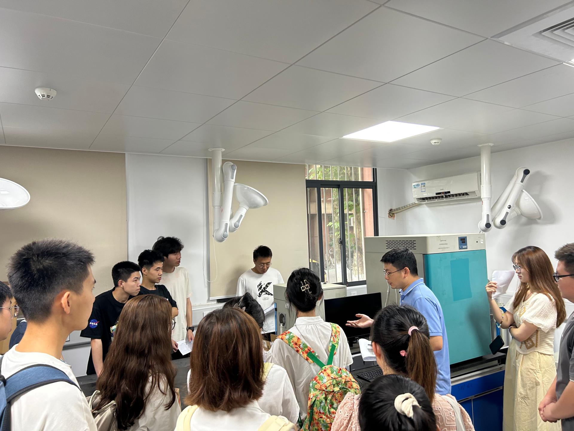 石油地质系教授杨锐带领员工前往核磁共振实验室、扫描电镜实验室参观。他向同学们介绍了实验室情况以及相关仪器的原理和使用方法,并现场演示仪器。
