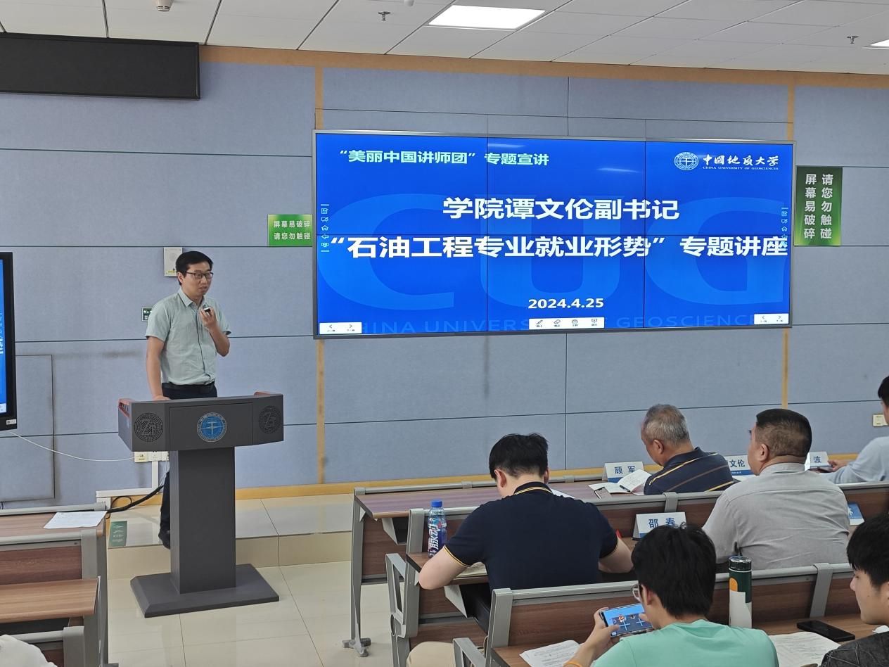 接着,谭文伦作“石油工程专业就业形势”主题宣讲。他介绍了石油工程专业在招生、转专业、就业等三个方面的情况,深入梳理和分析了近十年来石油工程专业的就业形势,并围绕员工招生、培养和就业等方面提出了有组织开展招生宣传、推进员工双创赛事、加大校企合作力度等相关意见。