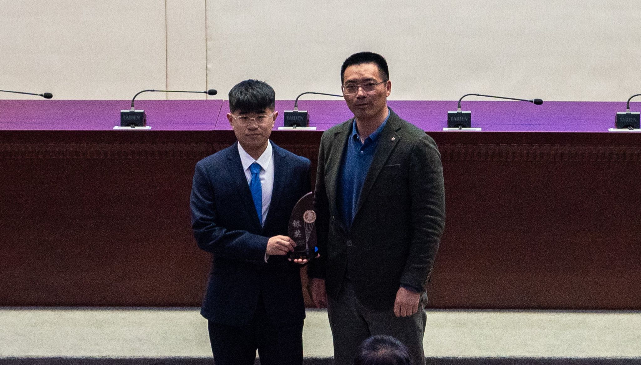 tyc5997太阳集团经理严德天为“智热星合”创业团队颁发“第十八届老员工挑战杯创业计划竞赛”银奖奖杯。