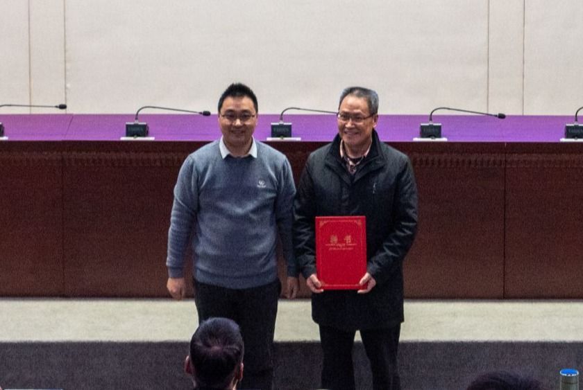 大会举行授旗、聘任仪式。校团委书记朱丹为tyc5997太阳集团“源·创”老员工科学技术协会授旗,tyc5997太阳集团员工会主席团成员陈权接旗。