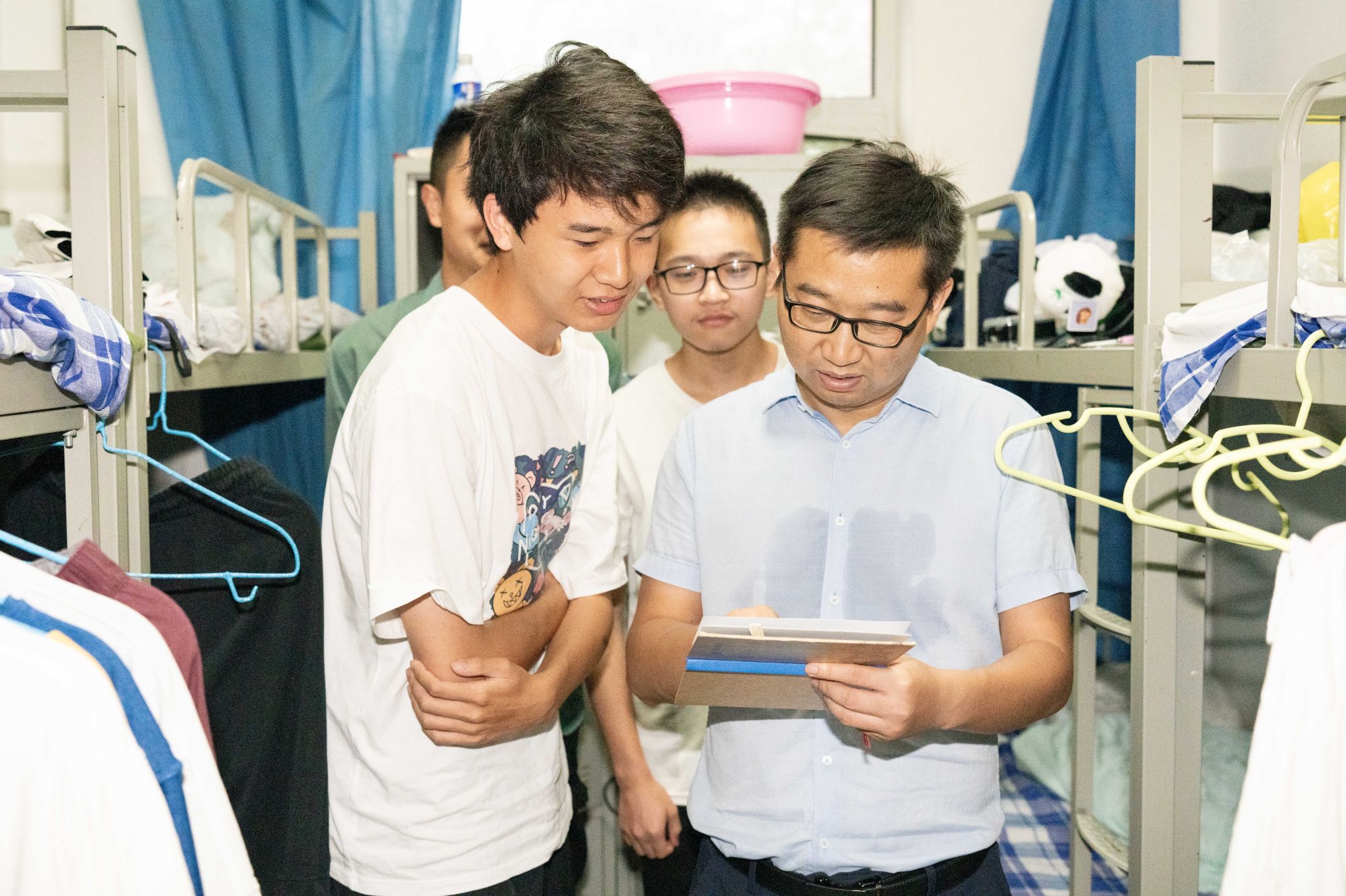 随后,谭文伦一行走访员工宿舍。他与同学们亲切交谈,查阅员工野簿和野外样品,了解在站学习和生活状况。