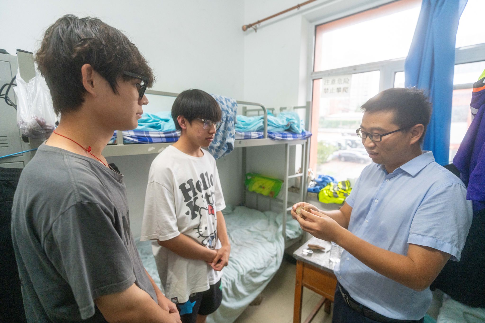 在员工公寓大厅,谭文伦为同学们发放消暑慰问品。他询问了同学们的食宿情况和实习体验,提醒实习期间要注意个人身体状况,希望同学们重视实践探究能力的锻炼,勇于提问、善于提问,在提问求证中将书本理论迁移至野外地质现象中,打好专业基础,浓厚专业兴趣。
